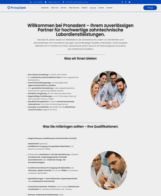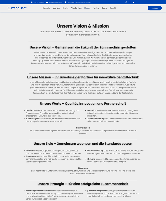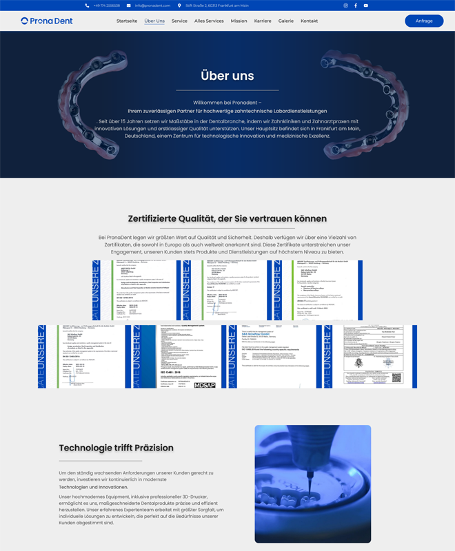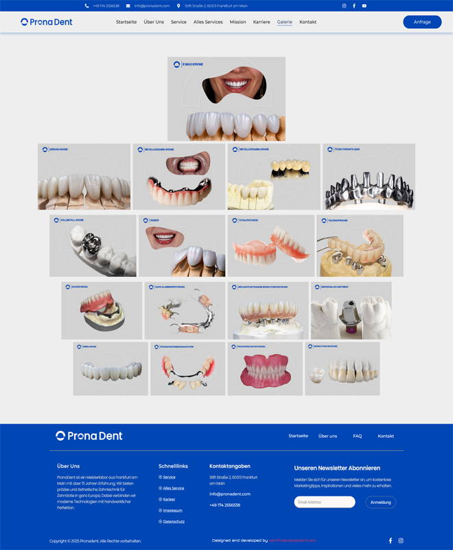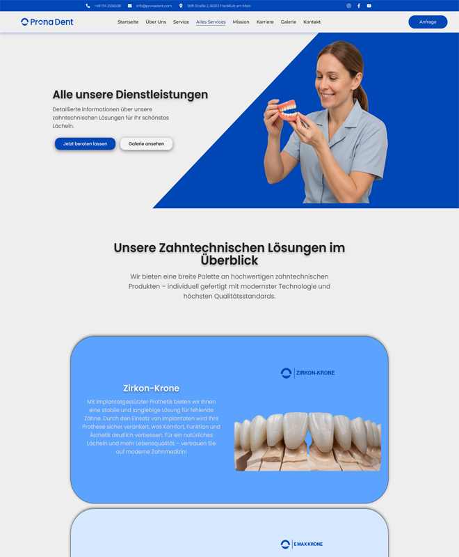 Уебсайтът на PronaDent е изграден с цел да подчертае международния авторитет и прецизността на денталната лаборатория. Проектът съчетава съвременен UX/UI дизайн с ясно структурирано съдържание, което представя услугите и технологичните предимства на компанията. Акцентът е поставен върху високото качество, индивидуалния подход към клиентите и модерната естетика. Благодарение на стратегически изградени секции и мобилна адаптивност, сайтът гарантира професионално онлайн присъствие и доверие още от първия клик.